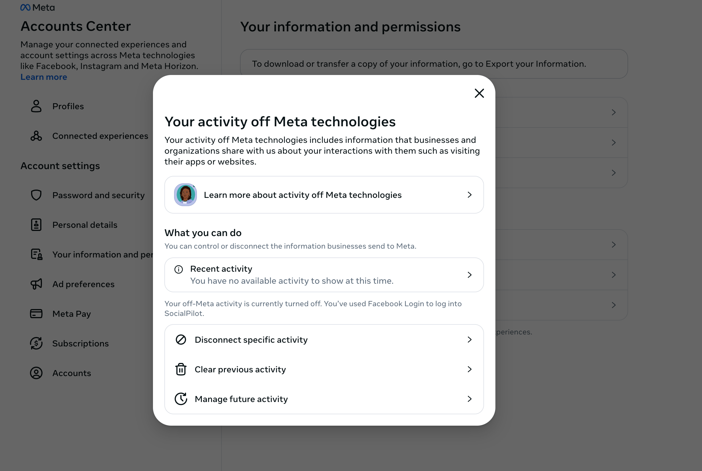 Off-Facebook Activity refers to the data that websites and apps share with Meta about your interactions, even when you’re not logged into Facebook or Instagram. Whenever you shop online, read an article, or use a service connected to Meta’s tools, these sites may send data back to Meta.